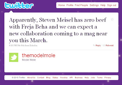 I guess it was a matter of time before this happened though. We had inklings that more could come when Freja worked with Meisel twice in a row for Vogue Italia at the beginning of the year. And some of us knew an upcoming collaboration was imminent. Thanks to the excellent sleuthing by commentator Amber in the comments section of this old post, we saw this tweet nearly a week ago from a "model mole."